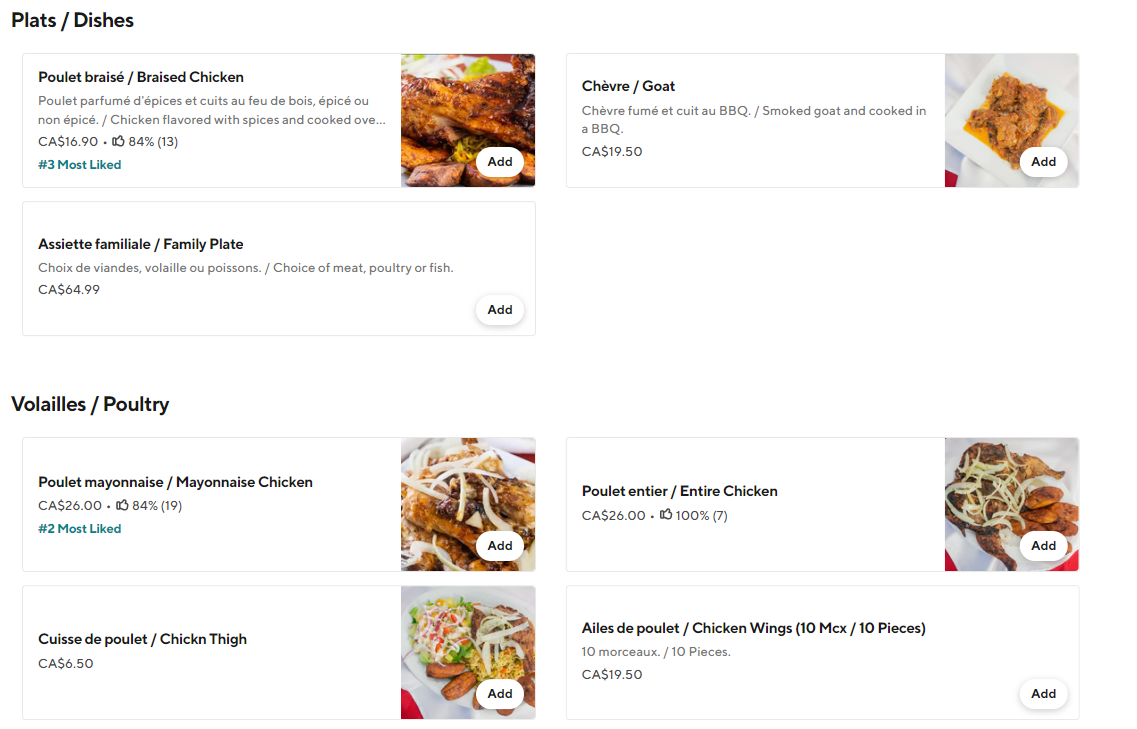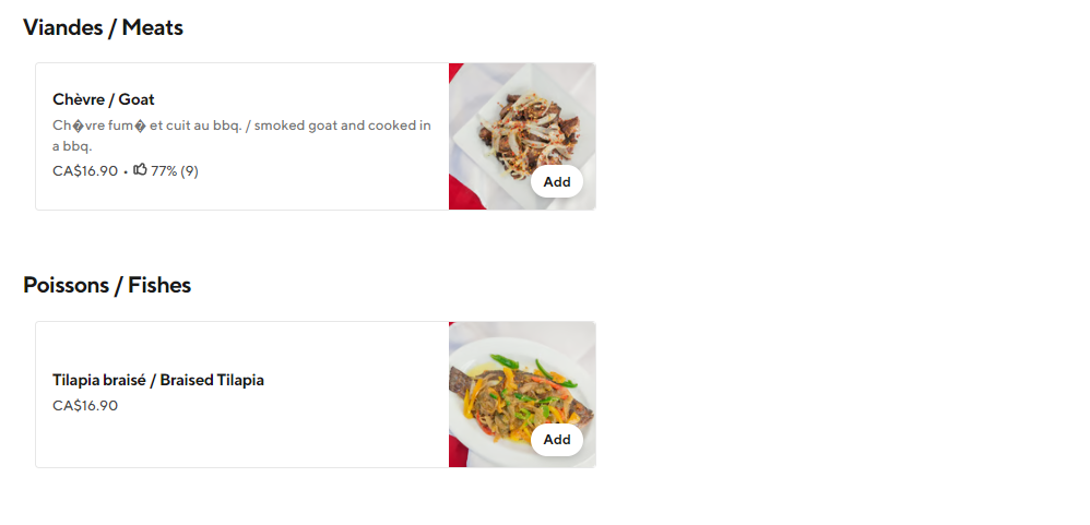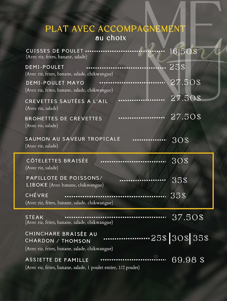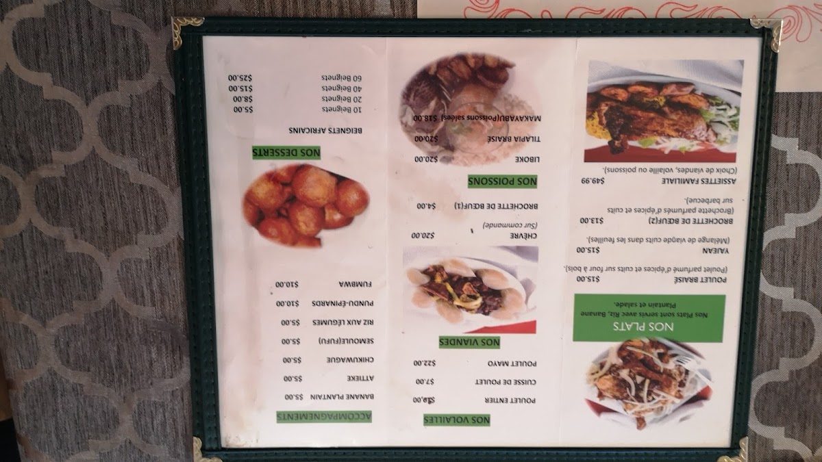 Explore the menu, where each dish tells a story of culinary heritage. One standout is the Brochette De Boeuf (Beef Skewers) at CA$16.90, perfectly marinated and grilled, infused with aromatic spices that entice your senses. The striking BBQ flavor is sure to satisfy any meat lover's palate. For a taste of the sea, the Tilapia Braisé (Braised Tilapia) offers a deliciously tender option, also grilled to perfection and seasoned with spices that awaken the flavors of Africa, priced at CA$19.50. Another must-try is the Poulet Braisé (Braised Chicken), where each bite resonates with warmth and spice.